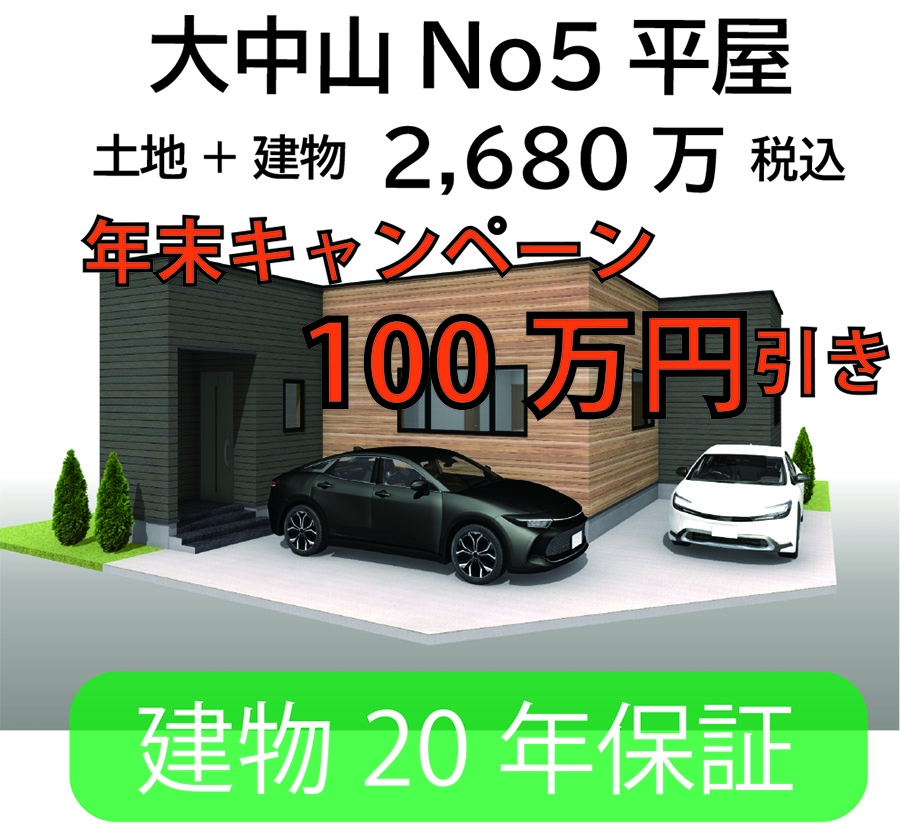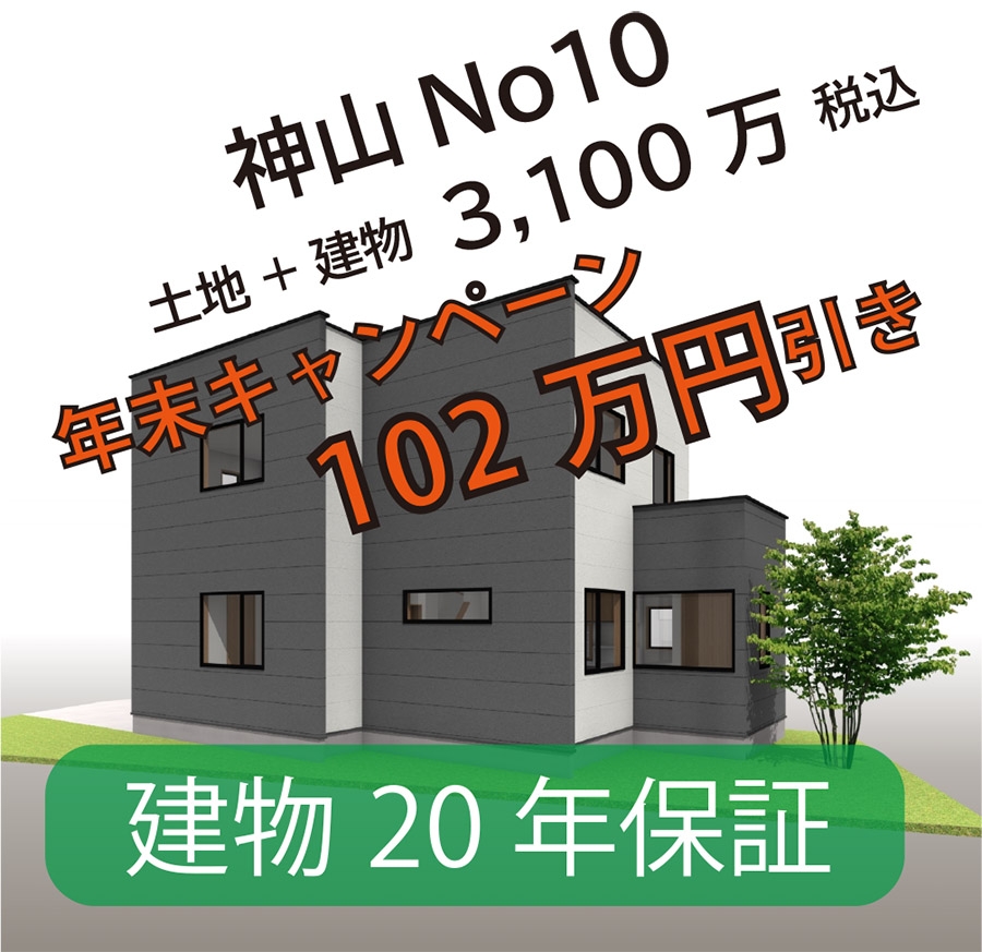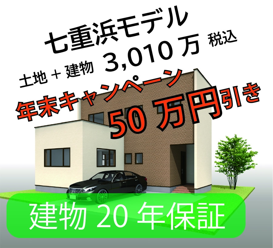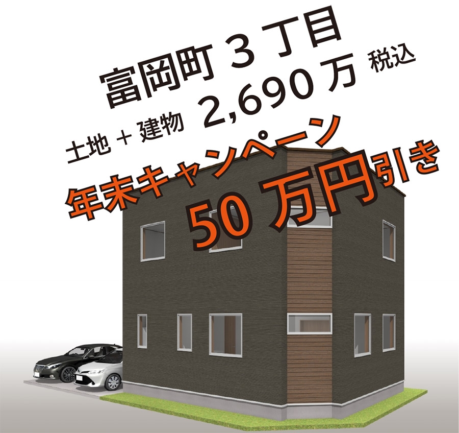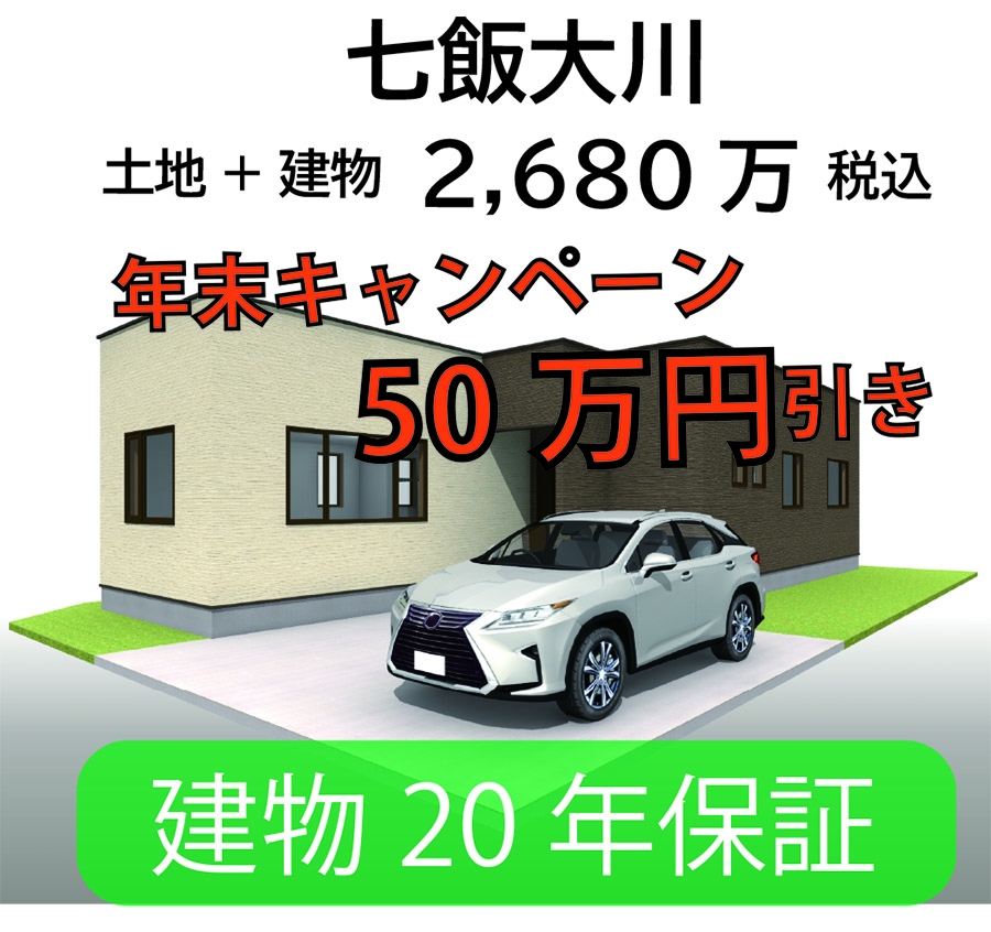 年末キャンペーン実施中! 2025/11/14 イベント 開催中 富岡町3丁目モデル 土地+建物 2,690万円⇒2,640万円 神山町№10モデル 土地+建物 3,100万円⇒2,998万円 七重浜モデル 土地+建物 3,010万円⇒2,960万円 七飯大川モデル 土地+建物 2,680万円⇒2,630万円 大中山№5モデル 土地+建物 2,680万円⇒2,580万円